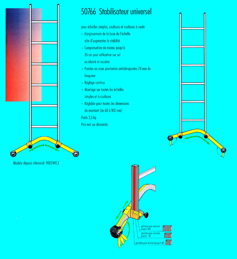 Pour une meilleure adherence sur sol accidente ou meuble, le stabilisateur universel est equipe de pointes acier pivotantes reglables antiderapantes de 70 mm de longueur |
