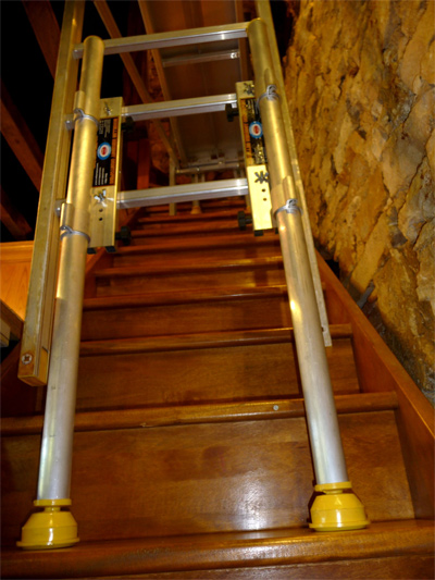une échelle dans un escalier, stabilisateur pour échafaudage, sécurisation